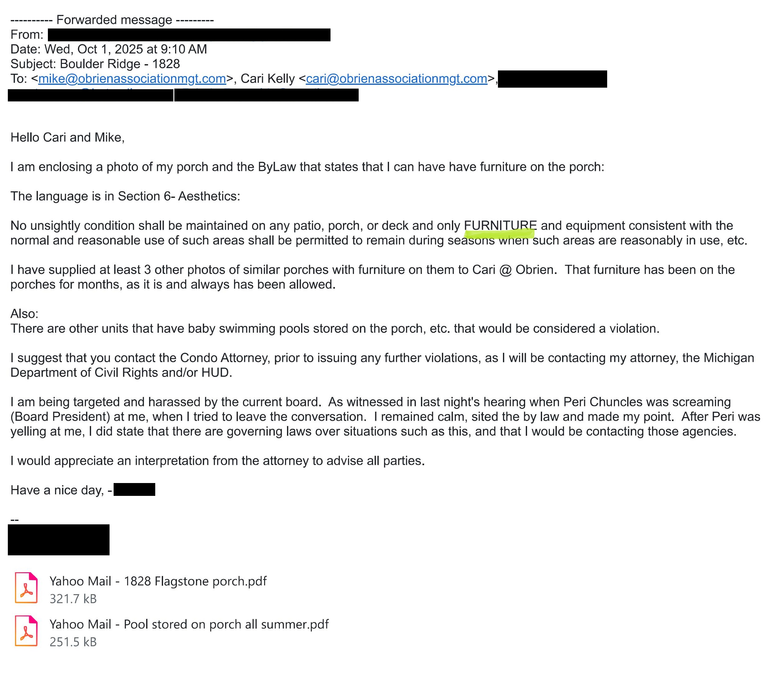 - The co-owner stated they were being targeted and harassed by the board